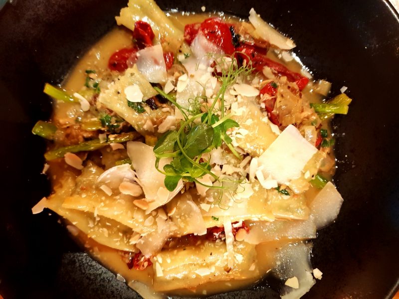 היה קשה לבחור מנת פסטה אחת מהתפריט העשיר והפור נפל על פסטת אנילוטי ריקוטה ותרד (69 ₪) בחמאת זעפרן ,כרישה, אספרגוס, עגבניות שמש, פרמז‘ן, שום ושקדים קלויים. אין כמו פסטה טריה וזו הייתה מנה עדינה כמו תכשיט ומדוייקת ביותר.