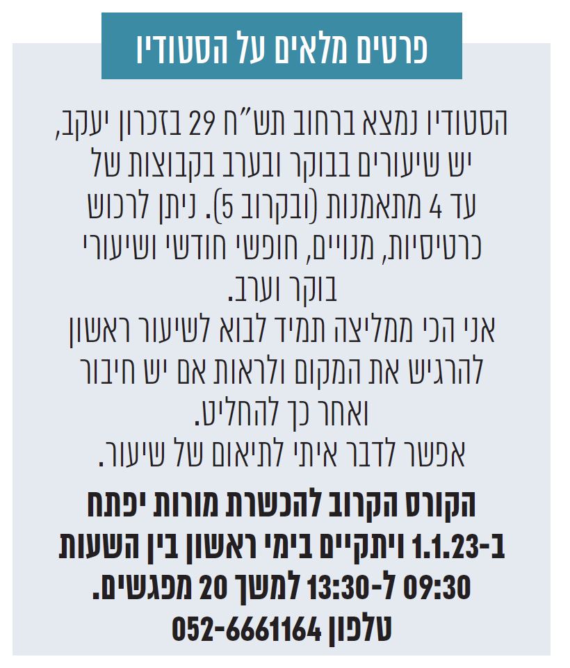 ב-1.1.23 בימי ראשון בין השעות 09:30 ל-13:30.
