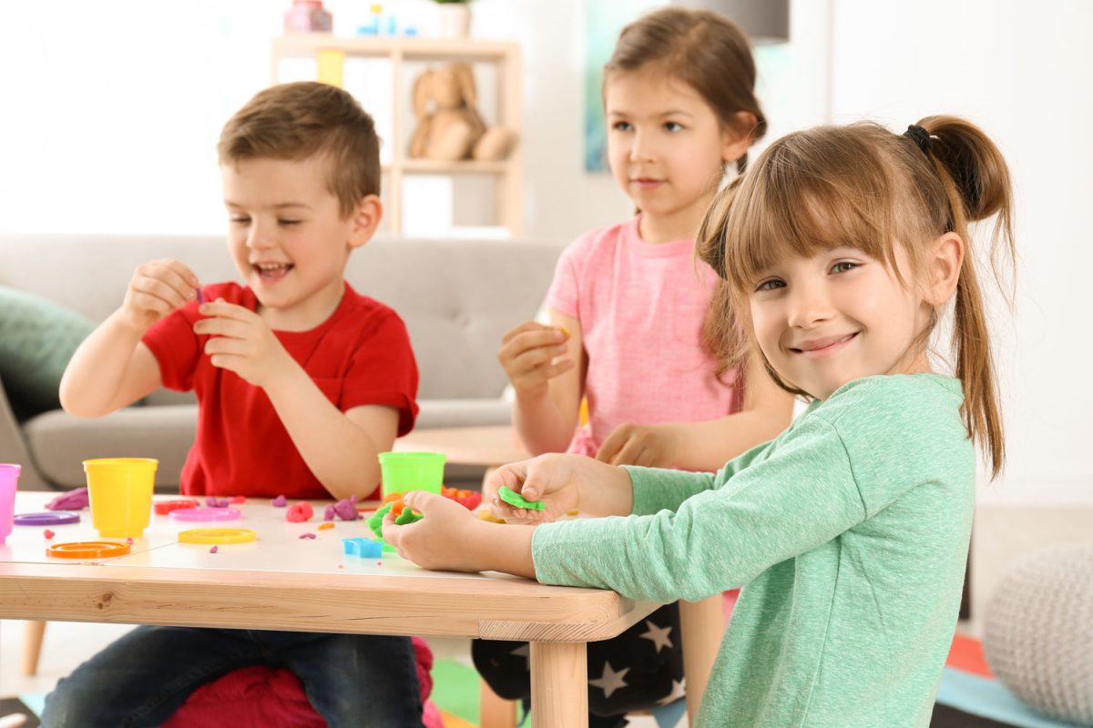 שתי ילדות משחקות בשולחן היצירה בפלסטלינה, מלבד הפלסטלינה הוספנו: מקלות גפרורים צבעוניים, עיניים זזות, פקקים