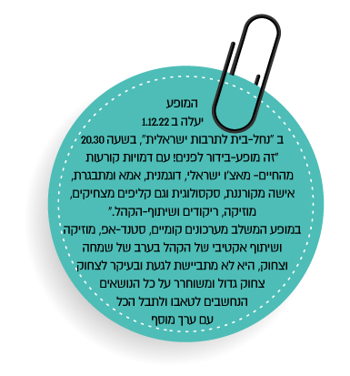 מופע הבידור שלי "אדרנלינדה!" יעלה ב 1.12.22 בתיאטרון הנח"ל, בשעה 20.30 "זה מופע-בידור לפנים! עם דמויות קורעות מהחיים- מאצ'ו ישראלי, דוגמנית, אמא ומתבגרת, אישה מקורננת, סקסולוגית וגם קליפים מצחיקים, מוזיקה, ריקודים ושיתוף-הקהל."