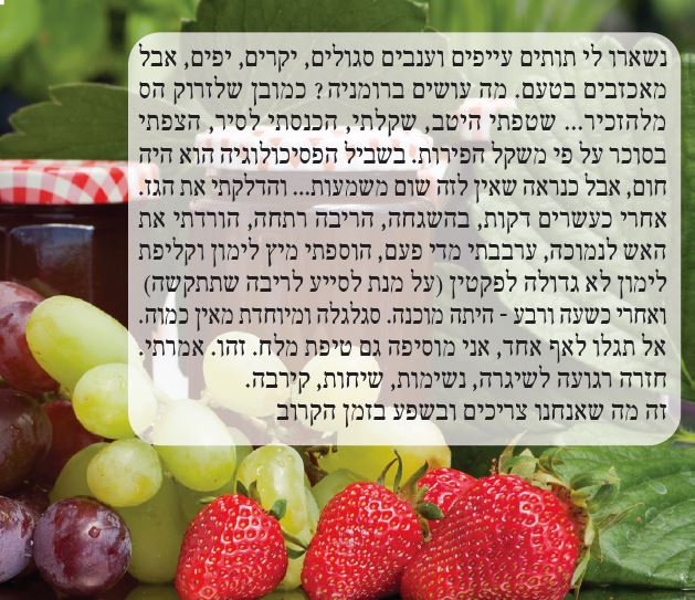 הזדמנתי לאחד הקניונים באיזור. בעודי הולכת לי לאט, סופגת קרני שמש נעימות ומתבשמת ממראות וקולות, פתאום שמעתי צלילים נעימים. היתה זו להקה, עם תחפושות מושלמות שניגנו ורקדו יחד והיו יפים ושמחים. אישה שמנמונת ומתוקה מחאה כפיים בהתלהבות ואילו אני.. בעודי מסננת לעצמי מתחת למסכה במרמור מה: ׳ממה היא מתלהבת…׳ פתאום הרגשתי שדמעות חמות ומלוחות חוצות את לחיי ונספגות במסכה המהוהה הפרחונית שלי.