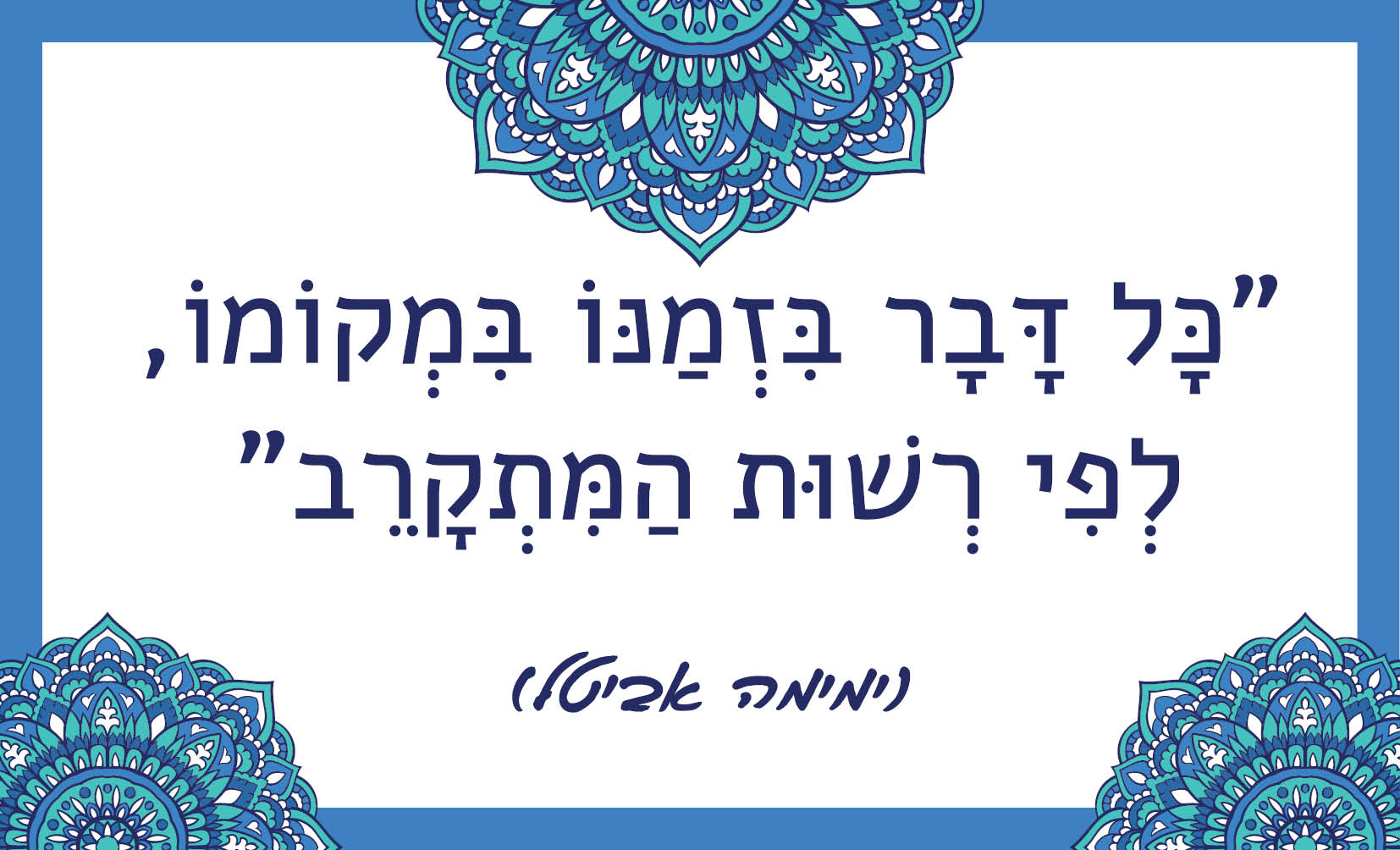 אז בואו נחסוך את האי נעימות ונבין ש ״כָּל דָּבָר בִּזְמַנּוֹ בִּמְקוֹמוֹ, לְפִי רְשׁוּת הַמִּתְקָרֵב״( ימימה).
